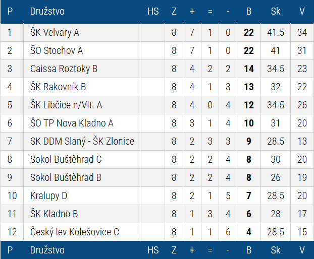 V 8. kole Stochov nastoupil proti Buštěhradu B. Jedinou změnou v sestavě bylo nastoupení Tomáše Zelenky na osmé šachovnici, což se ukázal jako šťastná volba. Po hodině hry získal první bod Gutman a v tu chvíli již bylo jasné, že právě Zelenka přidá druhý. O třetí se postaral Krabec a čtvrtý byl dílem Volfa. Na 5:0 pro Stochov pak upravil stav Padevět a poslední šestý přidal Tichonov. Po výhře 6:2 se tým oklepal z nepříjemné remízy z minulého kola a tentokrát to byly Velvary, které doma pouze remizovaly. Bodově se oba týmy srovnaly a vše směřuje k velkému finále v posledním kole, kdy Velvary přijedou na Stochov.
