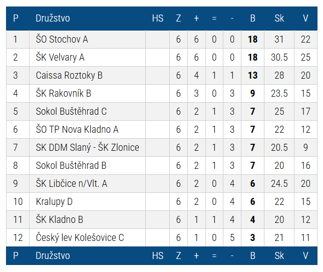 První půlbod uhrál Petr Gutman proti Jiřímu Míškovi a na ostatních šachovnicích byly pozice také vyrovnané. Soupeř Zdeňka Morávka se ale dopustil fatální chyby, ztratil celou věž a záhy se vzdal. Také Evžen Kotelenský dokázal skvěle zamíchat pozicí na šachovnici, dokonale zmátl soupeře a tomu nezbylo, než kapitulovat. Třetí výhru v řadě přidal Pavel Padevět a následoval ho František Sochor. Za rozhodnutého stavu ještě svojí partii vyhrál Jurij Tichonov a po remíze Jaroslava Krabce s Richardem Jermanem pečetil konečné skóre svojí výhrou Jaromír Volf. V utkání, kdy nikdo ze stochovských hráčů neprohrál, zvítězil ŠO Stochov A 7:1 a v průběžném pořadí se s lepším skóre posunul na první příčku před Velvary.